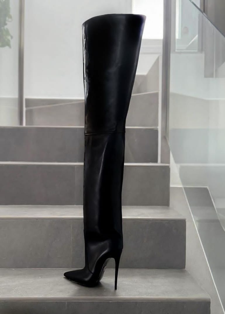 Modelul este realizat din piele naturală de calitate superioară și are o înălțime de 74 cm (fără toc), accentuând silueta prin contrast cu tocul subțire de 12 cm, elegant și stabil. Forma amplă a tijei transformă aceste cizme într-o piesă statement, ideală pentru ținute urbane, editoriale sau apariții de impact.