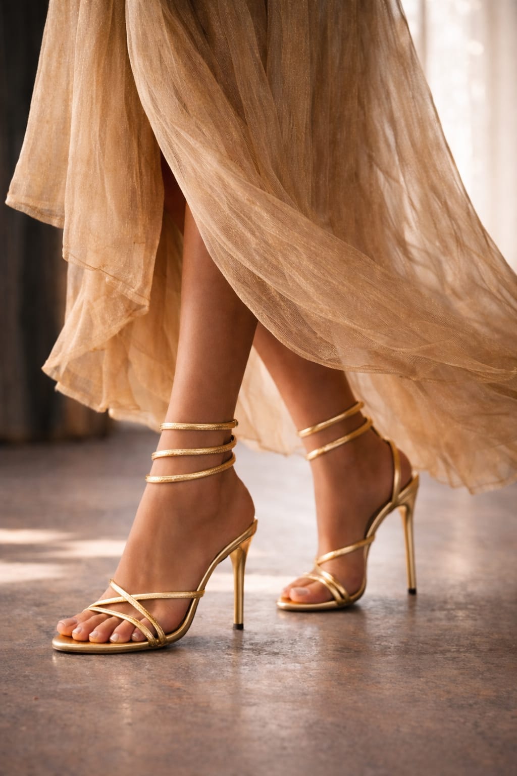 Despre linia piciorului pusă în valoare de tocuri fine, materiale fluide și detalii care învăluie glezna precum o bijuterie.